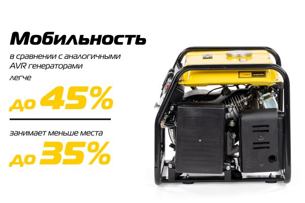 Инверторный генератор Champion отличается повышенной мобильностью и компактностью. Модель на 35–45% легче аналогичных AVR генераторов и занимает до 35% меньше места, что обеспечивает удобство транспортировки и хранения даже при ограниченном пространстве.