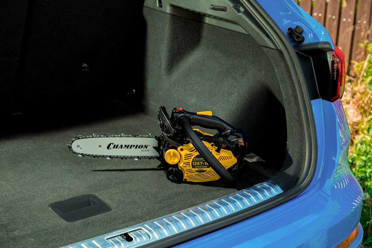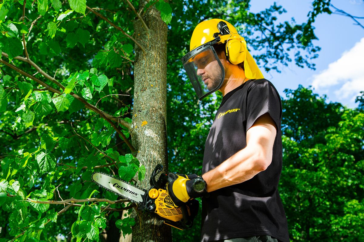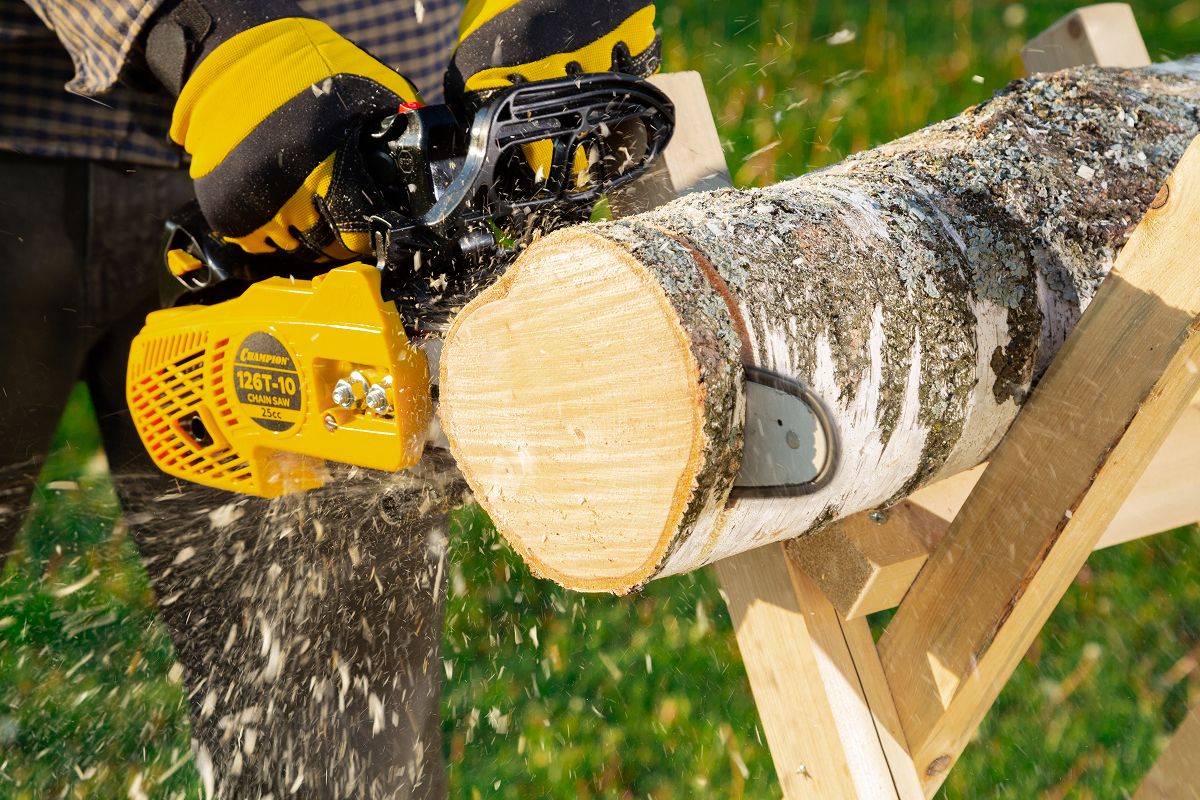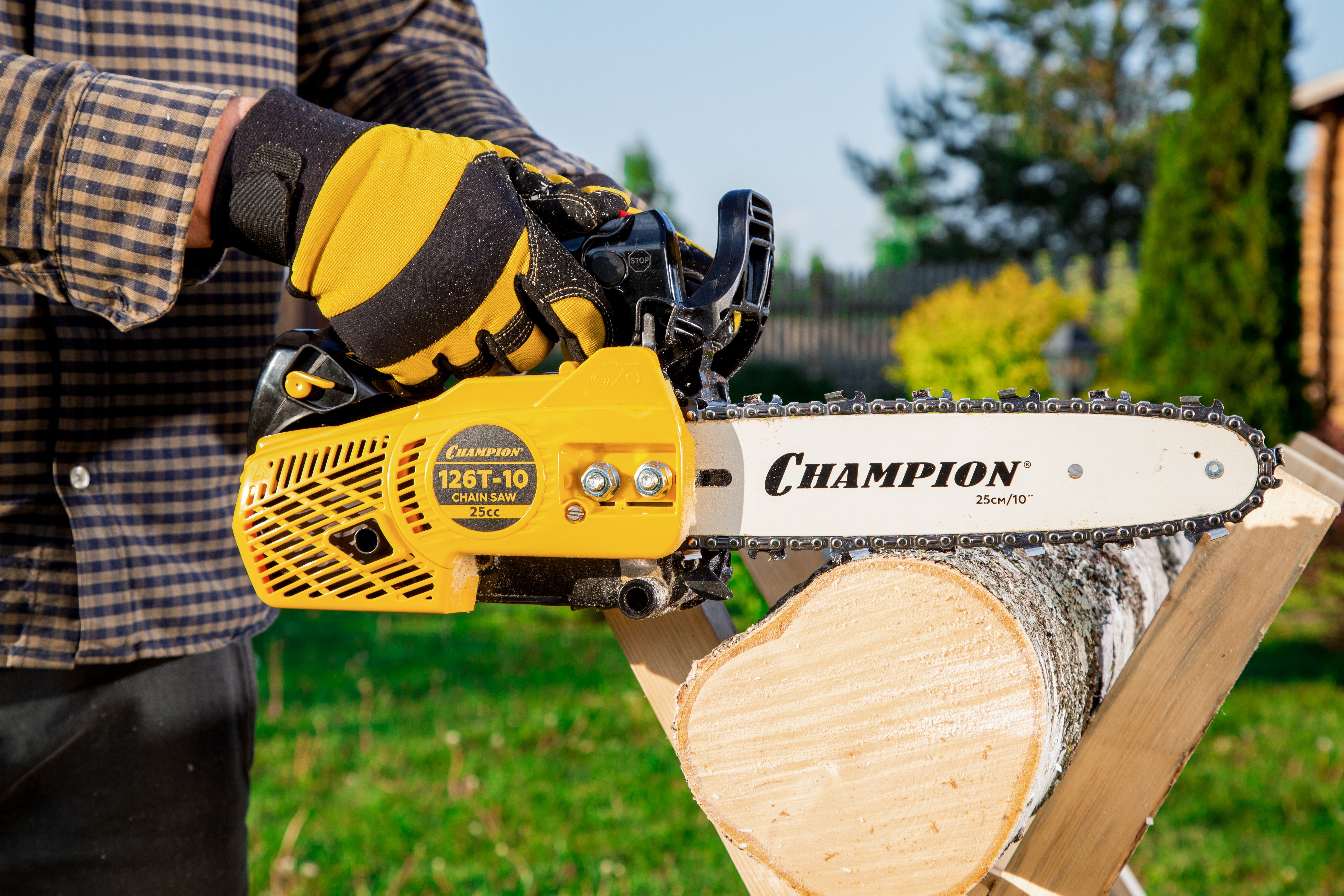 Бензиновая цепная пила Champion 126Т-10 — компактная, но мощная пила, которую арбористы используют на высоте, а туристы — в походах для заготовки дров.