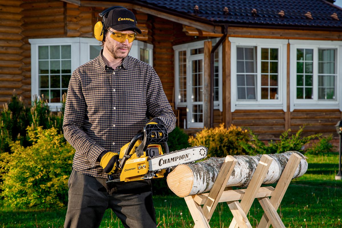 Мощность двигателя 1,5 кВт. Подойдет для обрезки веток и бревен диаметром до 20 см, а также для заготовки дров в небольших объемах.