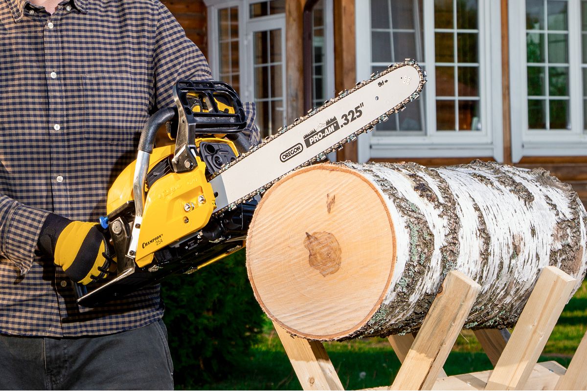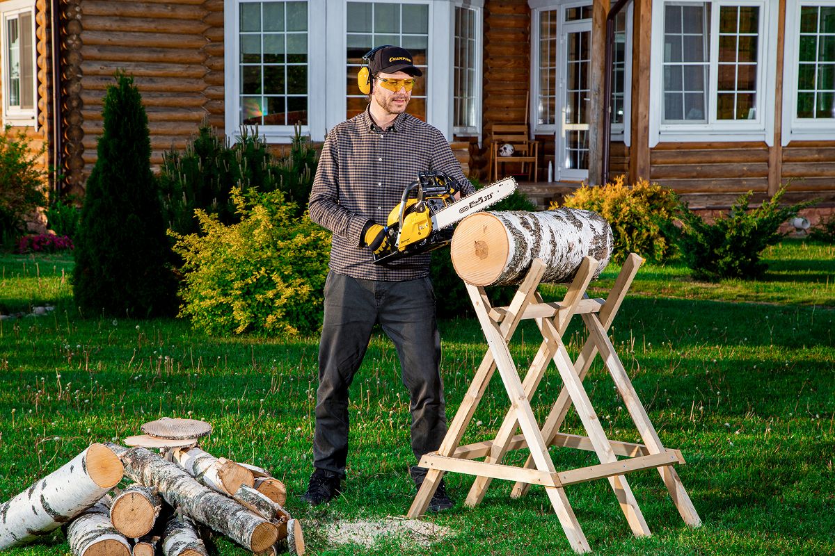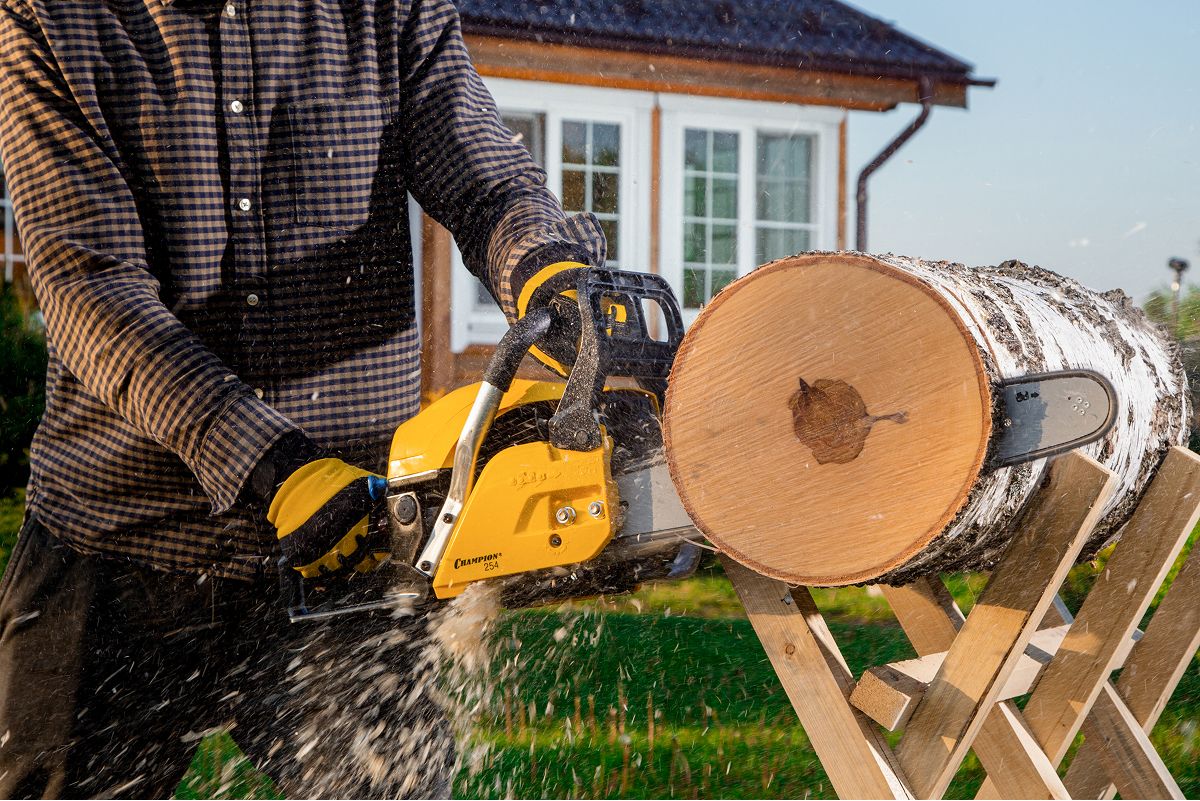 Двигатель мощностью 2,5 кВт. Пила предназначена для деревянного строительства, валки деревьев, распила бревен диаметром до 30 см.