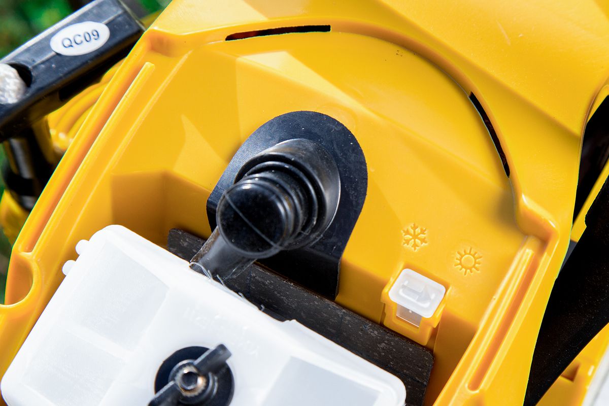 Оснащена инерционным тормозом и металлическим цепеуловителем, которые защищают от травм из-за отскока шины или обрыва цепи.