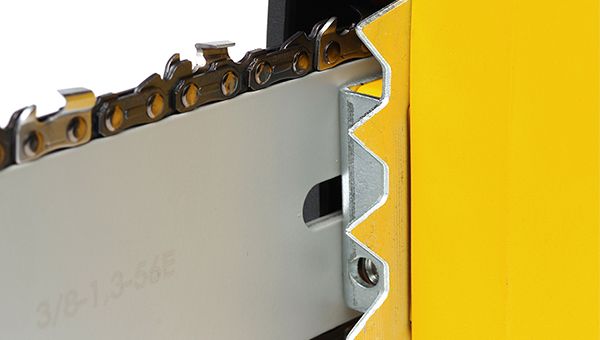Металлический зубчатый упор фиксирует агрегат у основания шины относительно бревна и препятствует срыву полотна из пропила, тем самым улучшает контроль над процессом пиления.