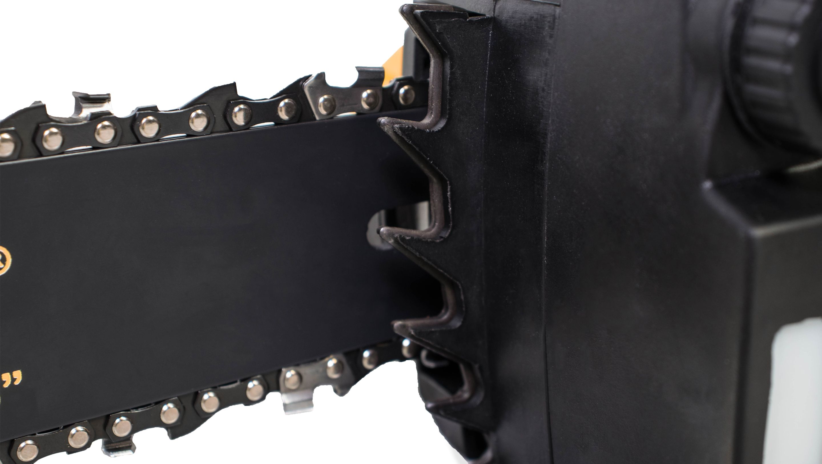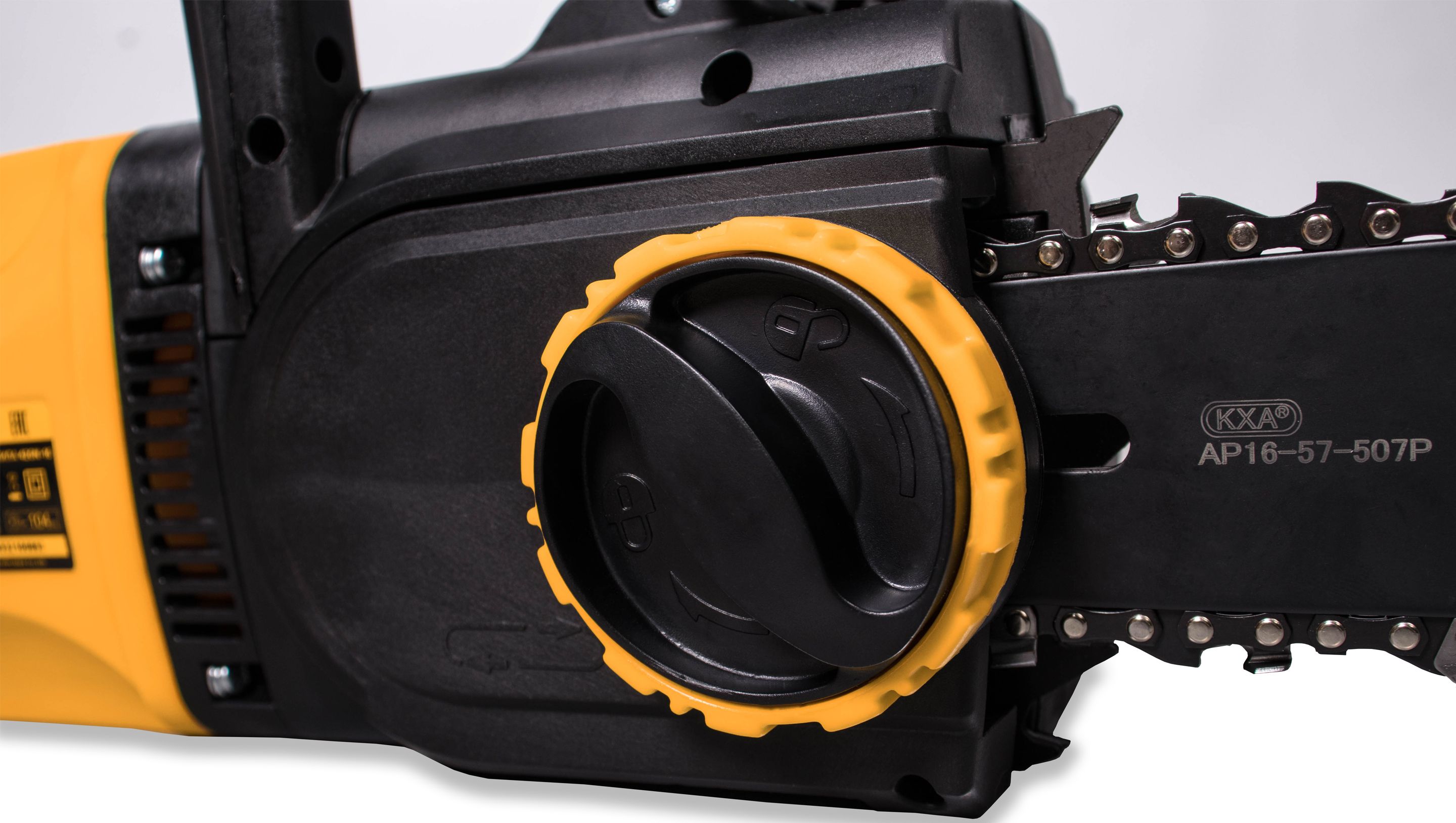 крышка шины фиксируется рукояткой безынструментального натяжения цепи, наружное кольцо регулирует натяжение цепи, а внутренняя гайка служит для крепления крышки и пильной шины