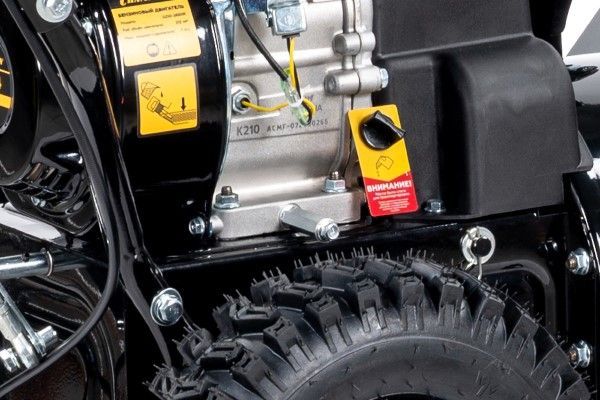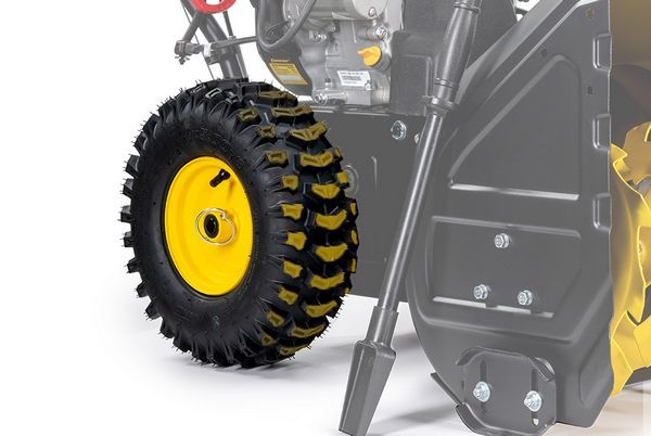 13-дюймовые пневматические колеса с глубоким агрессивным протектором не дают снегу налипать и обеспечивают уверенное сцепление даже на обледеневшем покрытии, мягко амортизируют движение на кочках и не проваливаются в снег, показывая отличную проходимость. На валу привода колес установлены стопорные кольца, которые предотвращают его выпадение при сборке и снятии колеса.